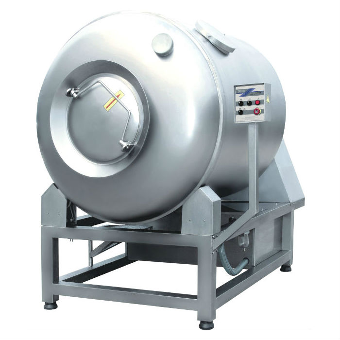 1. 采用轉(zhuǎn)動(dòng)支架,臥式傾斜滾揉,具有更大的裝載能力和更方便地卸料性能。適用于西式香腸、火腿、培根、烤肉以及傳統(tǒng)中式禽類、醬鹵類、休閑類肉食品的腌制加工。