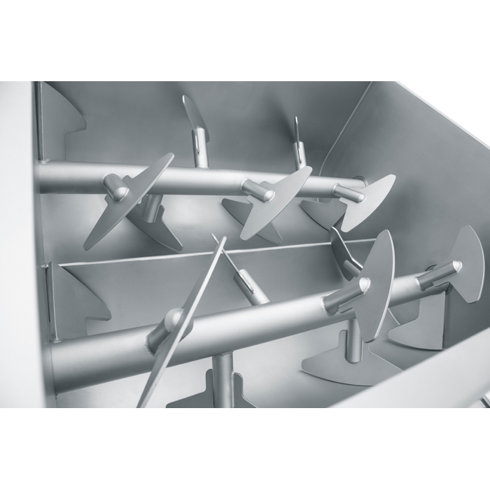 工作原理:采用雙軸橢圓比螺旋布置的扇形漿葉,對(duì)物料進(jìn)行徑向攪拌,同時(shí)完成軸向回流,使物料以得充分混合均勻,達(dá)到理想的混合效果。
