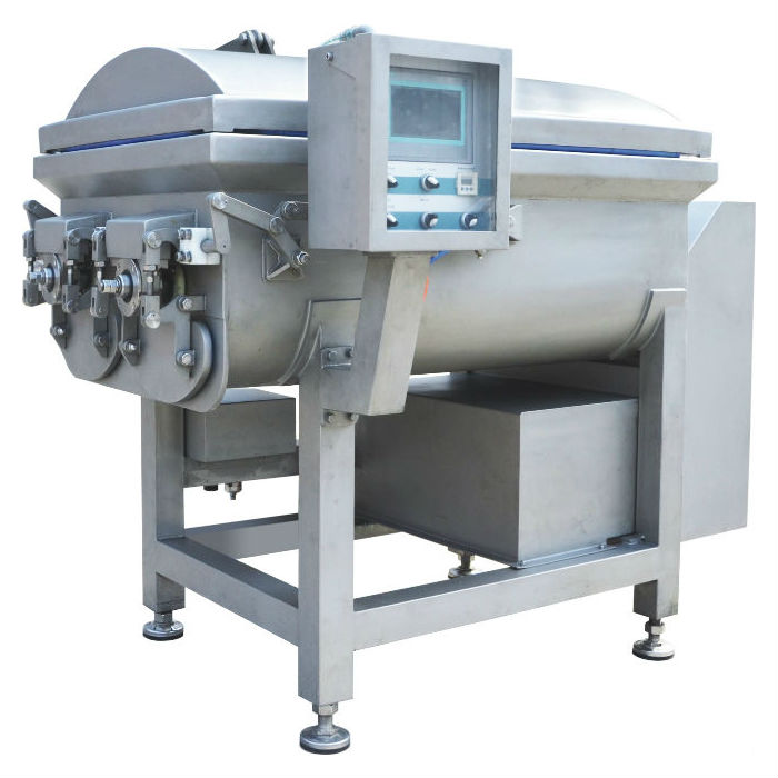 真空攪拌機是在原普通攪拌機的基礎上引進國際技術水平而改進的新型攪拌機。在真空的狀態(tài)下,物料被負壓后膨脹同時被槳葉進行徑向翻滾、軸向回流,完成混合均勻的攪拌功能,達到理想的攪拌效果,同時采用獨特的攪拌器,使拌出的肉餡纖維細化,并使肉纖維間的動物蛋白能游離析出,以保證肉餡拌和均勻并使之呈現蓬松狀態(tài),加入的調味汁液能充分吸收飽和,以保持餡料的松、鮮、嫩、口感味道優(yōu)異的特點。同時也是各類速凍水餃、包子、混沌等面食加工廠的理想設備。